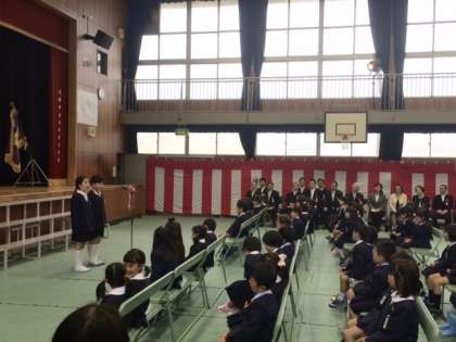 式が始まると、1年生のお友だちと手をつないで入場をし、入学式に参加しました。2年生と一緒に校歌を歌い、式の後には、在校生の代表として堂々とした姿で立派に挨拶を行いました。