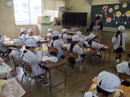 小学校で食べる初めての給食は、ハンバーグとコーンスープ、三度豆とレーズンパン。 「おいしい。」とうれしそうに食べる姿や、中には、おかわりをする子もいました。準備や片付けでは、6年生のお兄さんお姉さんがお手伝いをしてくれました。