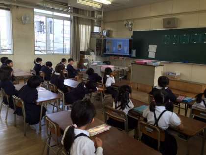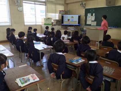 1年生も全市の小学校に配付されているDVD教材に集中して見入っていました。まだ、不安そうに英語を表現している児童もいますが、回を重ねるうちに積極的に英語を楽しめる児童を育んでいきます。