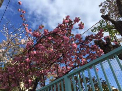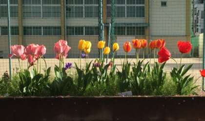 2年生が、昨年度の3学期に植えたチューリップや遅咲きの八重桜なども見ごろです。