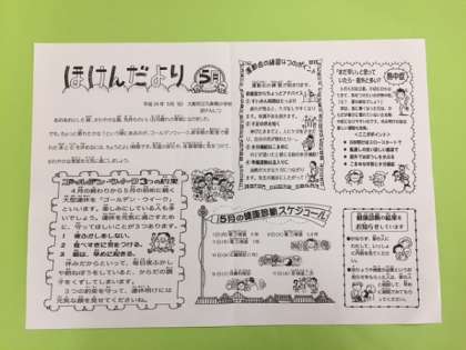 ほけんだよりには、ゴールデンウィークに守ってほしいことや運動会の練習のポイント、熱中症についてなどを載せています。ご家庭でも児童と一緒に読み、活用していただければと思います。ゴールデンウィークに疲れた体と心をゆっくりと休めて、体調管理に気を付けながら、これからの季節を元気に過ごしてほしいと思います。