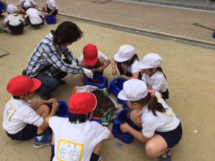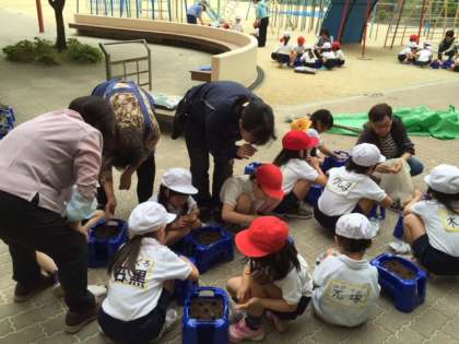 子ども達は6,7人のグループに分かれて鉢に土を入れるところから教えていただきました。「土はどのくらい入れるのですか。」「種を埋める穴はこれくでいいですか。」など、担任二人では目の届かないところも、しっかりと見ていただき、子どもたちは大喜びです。