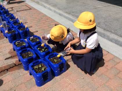 5月9日に植えたあさがおの芽が出ました。月曜日の今日は少しだけ顔を出しているのかなと思ったら、すでにかわいいちょうちょのような双葉が広がっていました。5本すべての芽が出ていた児童もいて、子ども達は、嬉しそうに水やりをしていました。