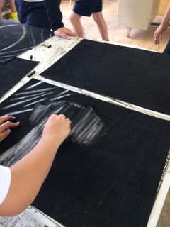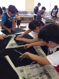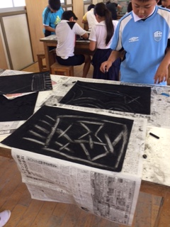 真っ黒な画用紙に白い線。コンテで黒く塗り込めた上から消しゴムで思い思いの模様を描きました。まさに「消して描く」です。コンテの粉で手は真っ黒。でも子どもたちは自分の表現に集中しています。すてきな作品になるでしょう。