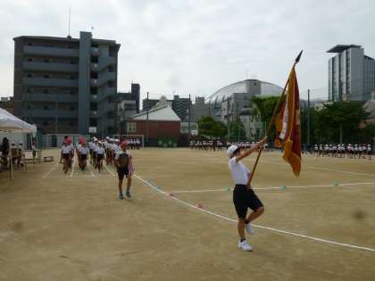 入場行進から始まり、開会式と閉会式の練習を中心に行いました。暑い中、水分補給を行いながら、約1時間子どもたちは集中して練習に取り組んでいました。