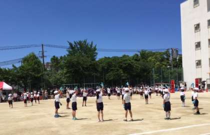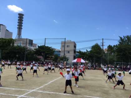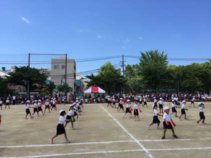 澄み渡る青空の下、1・2年生たちの元気な声が響き渡りました。ゆずの音楽にリズムを合わせ、笑顔でノリノリでダンスしました。暑い中最後まで本当によく頑張りました。