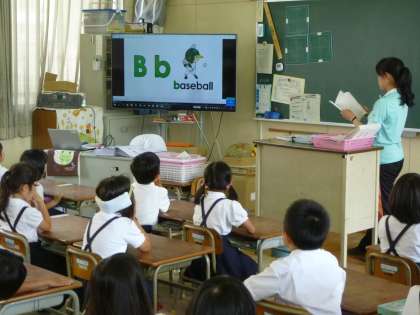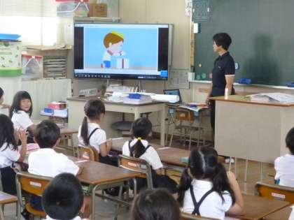 1年生は、お話「happy birthday」のDVDを見て英語を楽しく発音しました。