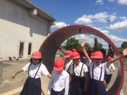 映像を見た後は、施設内の見学をしました。砂の層やオゾンなどを使って実際に水をきれいにしている池などを見たり、実際の大きさの配水管の中を、水の気持ちになってくぐりぬけたりしました。