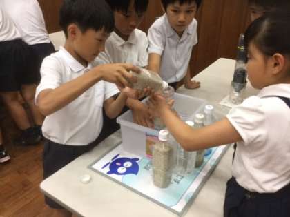 見学の後には、簡単なろ過実験を行い、実際に水がきれいになるまでを体験しました。2種類の方法でろ過を繰り返すと、汚れだけではなく、臭いも取ることができました。泥水が透明な水に変わったのを見て、「すごい!」と声をあげていました。