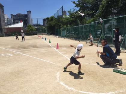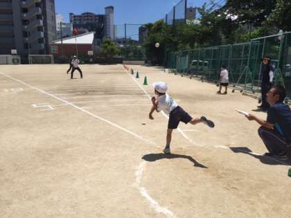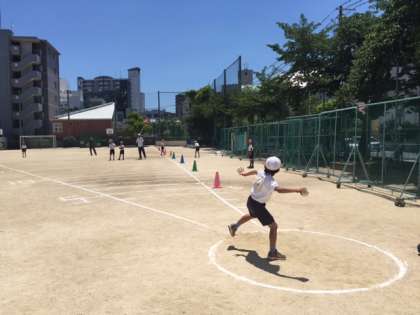 あんなふうに投げてみたい。子どもたちは角度やフォームを意識してがんばっていました。低学年でも30メートルを超える児童もいました。