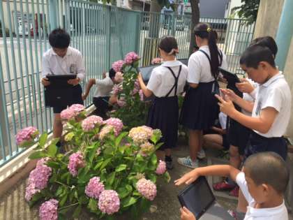 6月の花といえばあじさい。5年生は、図画工作科であじさいを描くために、自分たちで校舎に咲いているあじさいをタブレットで撮影しました。