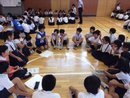 今日の集会は、九条南キッズカーニバルに向けた、たてわり班での話し合い活動でした。