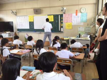 国語科の授業。まず漢字学習では、「形」という字を「かたち」にこだわって学びます。自主学習で書き順や形を学んだ後、間違いさがし形式でポイントを押さえて学びます。最後は、黙々とポイントを押さえながら漢字を書いていきました。次の「ことばで絵をつたよう」では、絵の特徴を「順序を表す言葉」と「様子を表す言葉」を使いながら説明する文章を考えました。分かりやすい説明をするために必要な言葉をしっかりと学んでいきました。