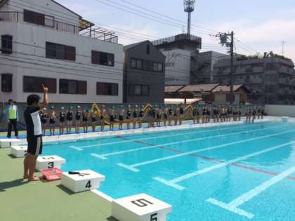 シャワーを浴びた後、音楽に合わせて体操を行い、簡単な水慣れや、け伸びなどをしました。その後は、現時点での泳力を確認しました。自分が今何m泳げるかを確認することで、自らのめあてを明確にし、今後の活動につなげていきます。