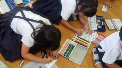 そして、C−NETの学習時に使用する名札作りにも挑戦しました。自分の名前をアルファベットで書いてみました。見本を見ながら、ていねいに書いた後は、絵を描いたり色をぬったりして完成させました。