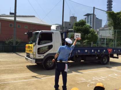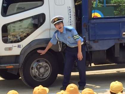 トラックの運転席からは小さい子どもたちは見えにくいことも分かりました。トラックから少し離れた場所で手を大きく振って存在を知らせることが重要だと教えていただきました。