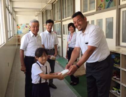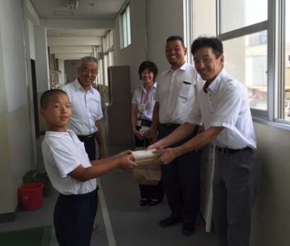 子どもたちが、普段なかなか会えない人にお便りをかくことで、豊かな発想を広げる機会にしてほしいとの願いを込めて、境川郵便局の局長さんと共に届けていただきました。