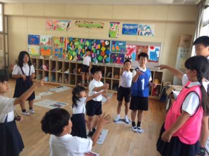 新聞の上に乗り、じゃんけんをします。あいこや負けてしまったときは、新聞がどんどん小さくなります。