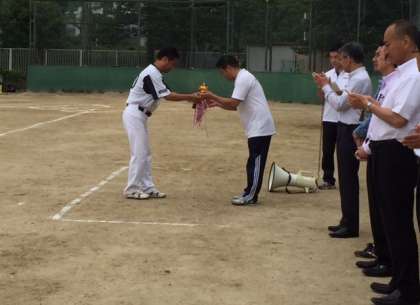 優勝カップをが本校PTAソフトボールチーム監督の嶋岡さんから森PTA会長に返還されましたが、必ずや今年度も優勝し、九条南小学校の玄関に戻って来ると選手も応援に駆け付けていただいた皆さまの信じています。