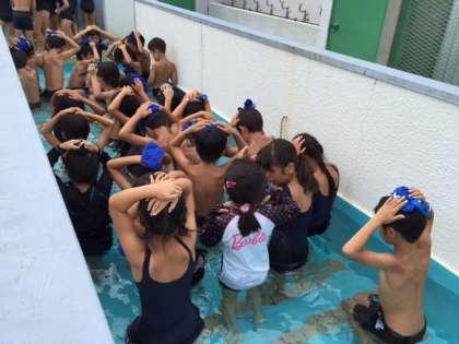 7月18日(火)は、水難事故やいざという時に命を守れるように着衣泳を行います。