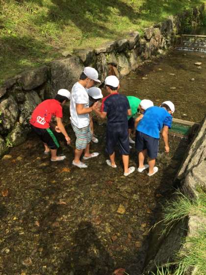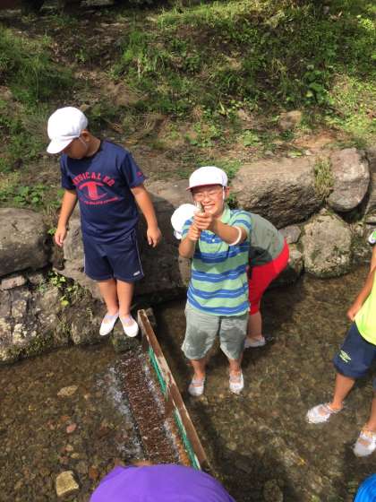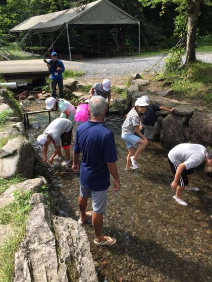 高原での活動で汗をかいた後の入水でしたが、小川の水はやはりかなり冷たいようで、子どもたちからは驚きの声があがりました。