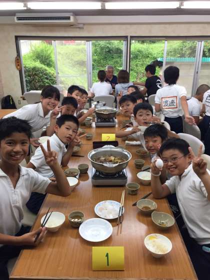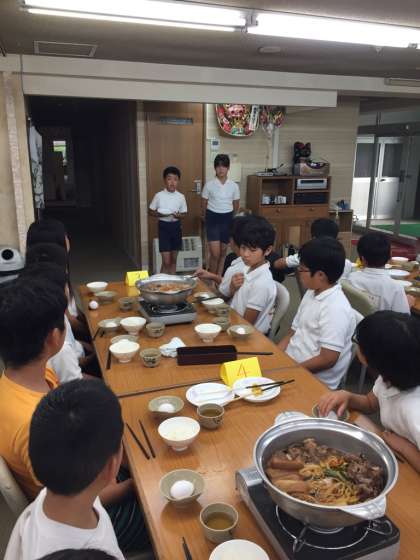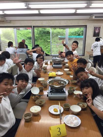 林間学習 2日目の夕食はすき焼きでした。栄養満点なすき焼きに全員が大満足。楽しく歓談しながら、モリモリパクパク食べていました。