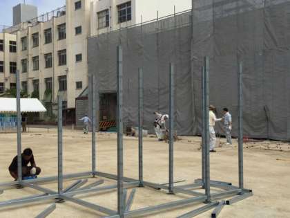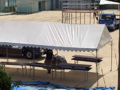 本日、8月16日(水)9:00〜 九条南連合振興町会会長をはじめ、九条南連合町会の役員の皆様が九条南小学校の校庭に一堂に会し、立派な櫓が組まれました。