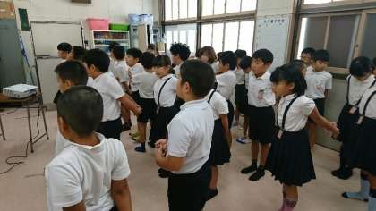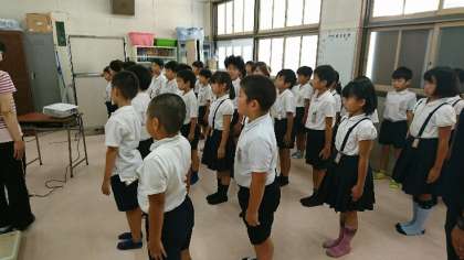 姿勢が良くないとどうなると思う?と子どもたちに質問すると、「背骨がまがる」などの答えがかえってきました。他にも、内臓の働きが悪くなることや、集中力が低下する、歯並びが悪くなることがあることなど伝えています。そして姿勢をよくするために心掛けることなどを話しています。また、実際に授業を受けている各クラスの写真を見せ、日頃の様子を振り返る機会としました。みんなで、正しい姿勢で起立・礼の練習をしたり、ストレッチなども行いました。また、お家でも、子どもたちと正しい姿勢が出来ているかを見直し、姿勢について話す機会を持っていただけたらと思います。