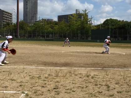「西区PTA親善ソフトボール大会」九条南小学校PTAソフトボール部は第1回戦を10点以上の差をつけて圧勝しました。