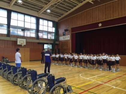 今日は、大阪市立心身障がい者リハビリテーションセンターの方々に来ていただき、車いす体験学習を行いました。