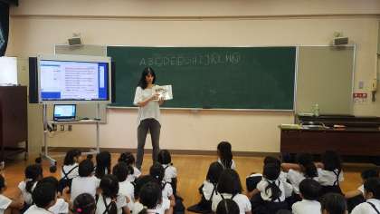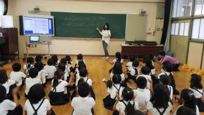 そして、今回は新たに「toy(おもちゃ)」のことばを学習しました。自分の家にあるおもちゃが登場すると、子どもたちも意欲的に新しいことばの学習に取り組みました。最後は、1組2組で、「おもちゃ」のことばを使ったじゃんけんゲームで、チャイムの音に気がつかないぐらい盛り上がっていました。
