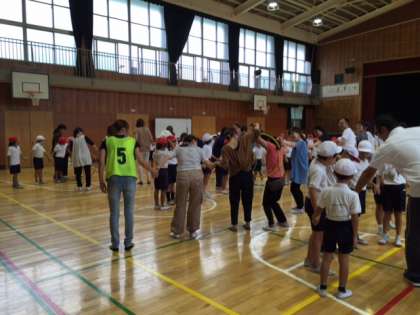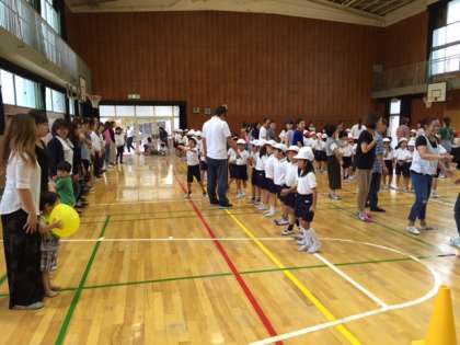 続いて行われたフープくぐりも、一列になって手をつなぎ、お隣の友だちと協力してフープを上手にくぐれていました。