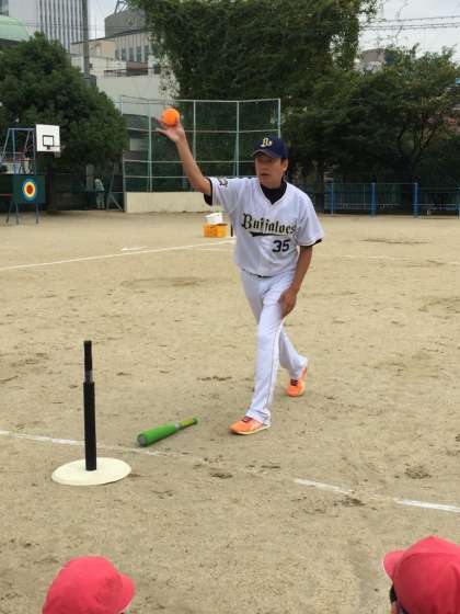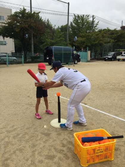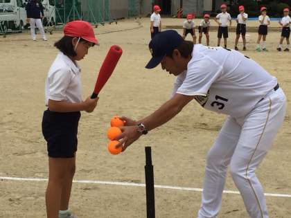 オリックスTボール教室では、プロの選手からボールの投げ方やバッティングのコツをていねいに教わりました。