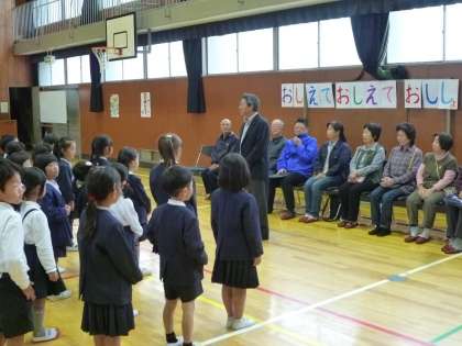 1年生の出会いふれあい教育「おしえて おしえて おししょうさん」を行いました。地域の方々に、「あやとり」「おてだま」「メンコ」「けんだま」「こま」「ヨーヨー」「おはじき」の7つの昔あそびを教えていただきました。