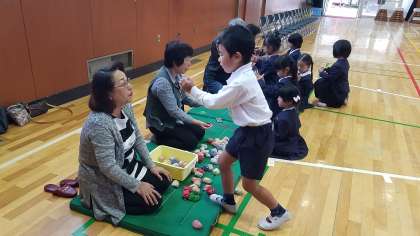 お手玉を上からつかもうとして、繰り返し続けることに苦戦している児童がいましたが、「手のひらを上に向けてとると良いよ。」とアドバイスを聞いて、何回も続けてできるようになっていました。
