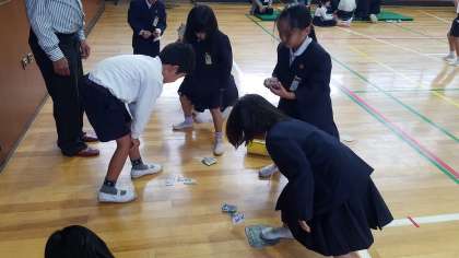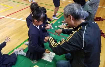 メンコを初めて手に取った児童も多く、遊び方を教えてもらうと、「パシッ」と良い音を体育館に響かせ、メンコを裏返すことに挑戦していました。