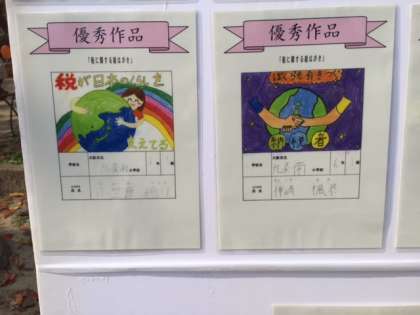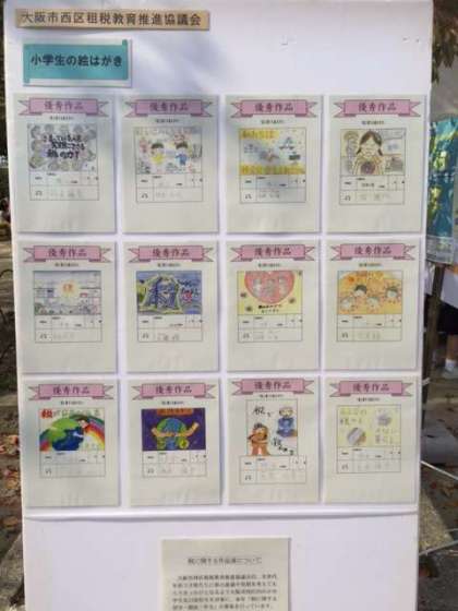 文化のつどいの会場には、大阪市西区租税教育推進協議会主催の税に関する絵はがき・習字の優秀作品が展示されています。