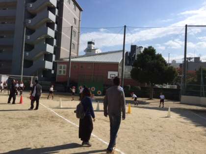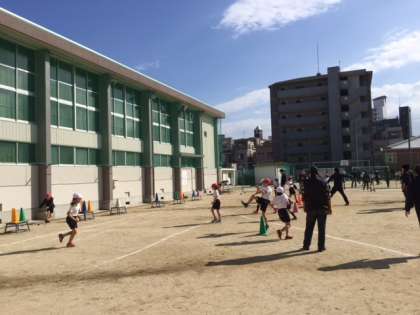 中学年の「遊びに行くDAY」は、おうちの方々とTボールで三角ベスボールの試合をしました。