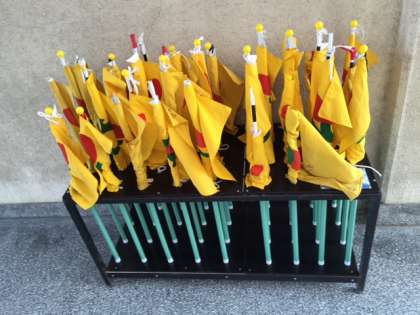 今までの台は、旗をさすと棒が不安定に動き旗が交錯していました。棒の部分が傷む原因にもなっていたため、管理作業員が自作し、安定感のある物にしました。
