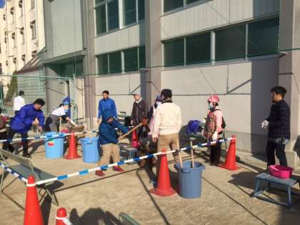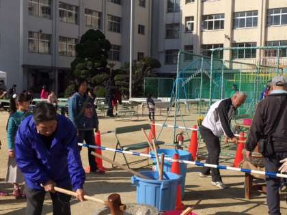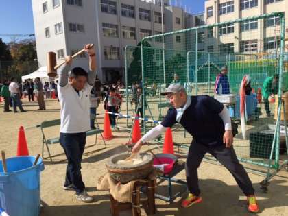 冬の寒さも緩み、餅をつくと汗ばむような晴天の中、九条南子ども会、体協、PTA合同で開催されたお餅つき大会は、大勢の来校者でにぎわいました。