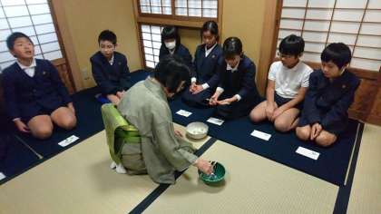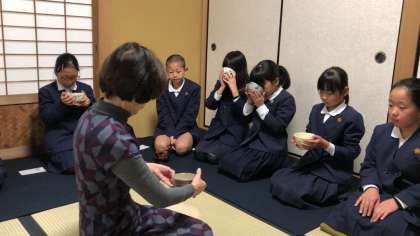 最後に、先生のお点前を拝見しました。一人一人に抹茶が運ばれると、先生の所作をお手本にお茶をいただきました。4年生にとっては、少し苦く、大人の味でしたが、伝統的な日本の文化に触れるよい機会でした。