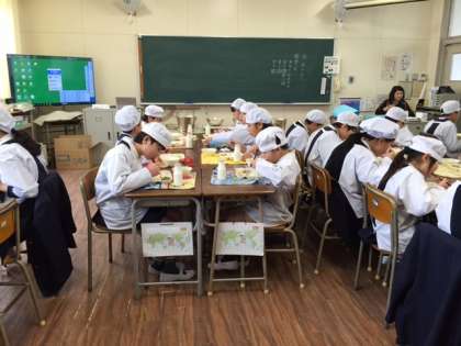 普段は、食が進まない食材も高学年の児童が美味しそうに食べる様子を見て、低学年の児童もパクパク食べていました。