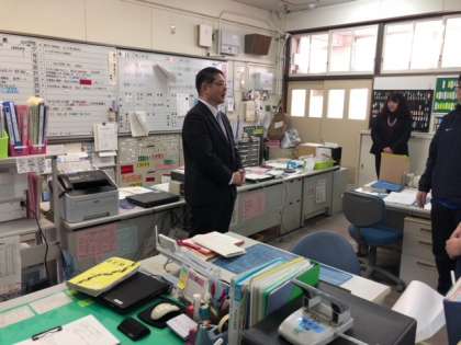 教職員への挨拶では、今回の実務研修でも、多様な教育活動を見せていただきました。コミュニティースクール機能が充実しており、教員の皆様も前向きにスキルを磨いて様々な形態で授業を展開されていることが、とても参考になりました。今後、様々な職業が様変わりをしていき、グローバル化も加速することが予想されます。4月のスタートに向け、未来を生き抜く人材の育成をめざし、英語教育をはじめとする様々な具体的な方策を練り、校長としてがんばっていきたいと思っています。と力強くお話しいただきました。