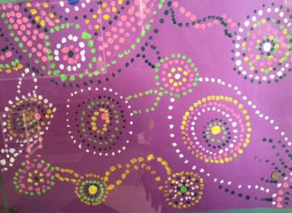 学校の玄関には、5年生の「アボリジニ アート」が並んでいます。「アボリジニ アート」は、オーストラリアの先住民発祥のアートです。