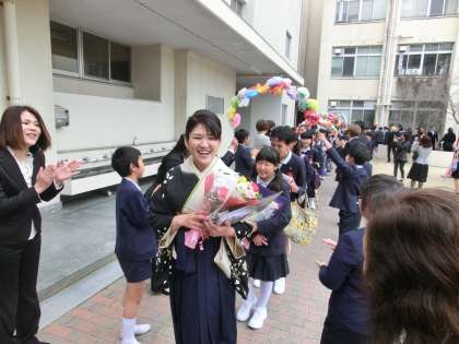 卒業証書授与式終了後には、保護者を代表し、山崎様より教職員に向けて謝辞が読み上げられました。気持ちのこもったごていねいな謝辞をありがとうござました。