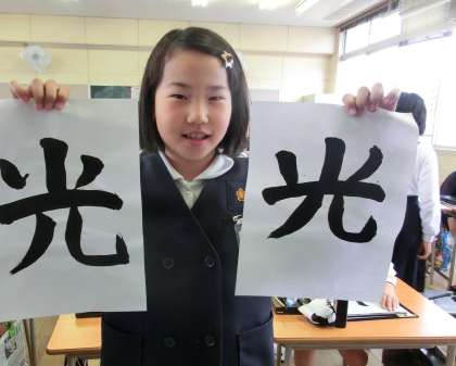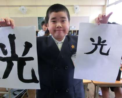 4年生になって初めての習字の学習をしました。はじめにお手本を見ないで1枚目を書き、お手本と比べて自分の課題を見付けた後練習、清書と取り組みました。最後に1枚目と清書を比べてハイチーズ。上手になったところを認め合いました。参観で掲示していますのでご覧ください。
