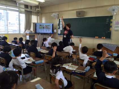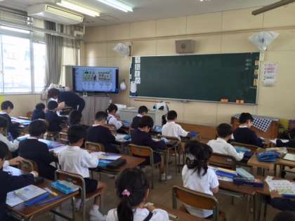 大型モニターに映し出された画面を見て、考えたことを一所懸命に伝える1年生の姿に感心しました。