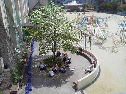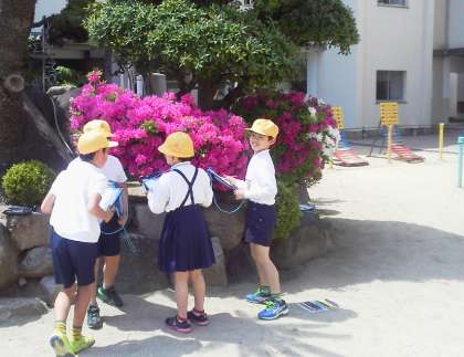 熱いくらいの日差しの中でしたが、満開のハナミズキやつつじなど、春の草木の様子を、一人一人がしっかり観察し、記録していました。友だちとも気付いたことを話し合い、学習を深めていました。