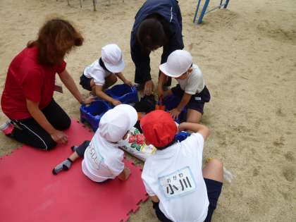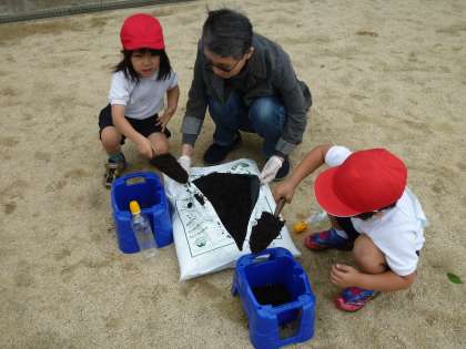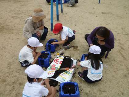 子どもたちは、10グループに分かれて鉢に土を入れるところから教えていただきました。「土はこれくらいでいいですか。」「種を埋める穴はこれくでいいですか。」など、担任だけでは目の届かないところも、しっかりと見ていただき、子どもたちは大喜びでした。