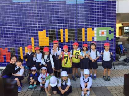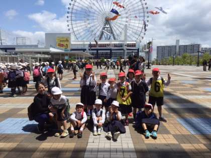 見学の後、海遊館の周りで、一息つき、「ハイ、ポーズ!」